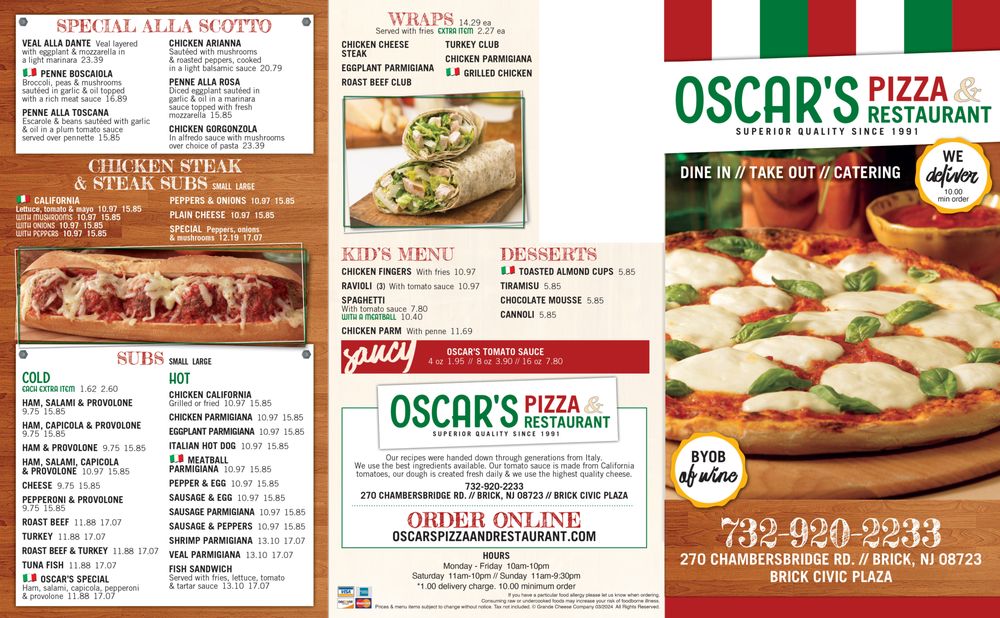 Welcome to Oscar’s Pizza & Restaurant, a cozy Italian gem nestled in Brick, NJ, offering a delightful menu that combines authentic flavors with a warm, welcoming atmosphere. Known for its mouthwatering pizzas, Oscar’s delivers a delightful experience for both families and groups alike.